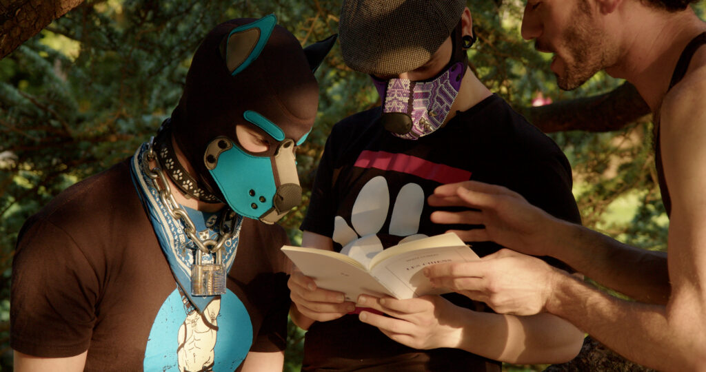 Multimedia artist Matthew Lax has a show at Human Resources, about pup play kink. And by “about” I mean capital-A “About”. As in: the show revolves around its theme like carousel horses around the unseen mechanism within. There are videos of kinky french pups in masks as well as humans dealing in a variety of ways with real dogs, video of the artist’s attempt to act like and get along with a dog, an animation of a dog, bad dog drawings (the kind that feel like the artist knew they were inadequate outside of the larger context), and doggish flashing pictures. There is a giant dog crate as well.